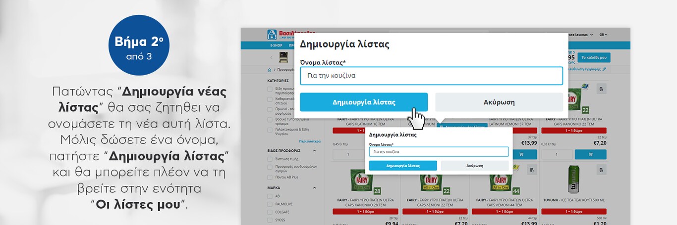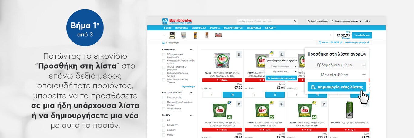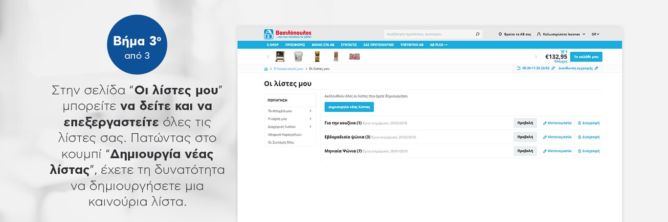 Μάθετε πως μπορείτε εύκολα και γρήγορα να δημιουργήσετε λίστες και να προσθέσετε προϊόντα σε αυτές. Για να δημιουργήσετε προσωπικές λίστες αγορών θα πρέπει να διαθέτετε λογαριασμό στο ab.gr και να έχετε συνδεθεί σε αυτόν.